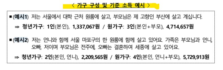 -소득평가액은 청년가구 기준 중위소득 60% 이하(1인가구 134만 원) , 원가구 기준 중위소득 100% 이하(3인가구 471만 원)